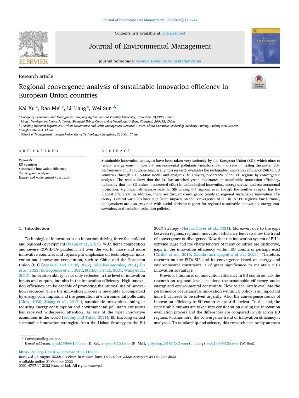 管工学科徐凯博士研究成果在权威期刊《Journal of Environmental Management》发表 近日,十大买球官网管理科学与工程学科青年教师徐凯博士撰写的论文 《Regional convergence analysis of sustainable innovation efficiency in European Union countries》在SCI权威期刊《Journal of Environmental Management》(ABS 3星, ABDC A,JCR Q1, 中科院2区top)发表。这是十大买球官网首次作为第一单位在该期刊发表论文。 该论文主要研究了能源、环境约束下的欧盟国家的可持续创新表现,并实证检验了各个地区创新效率的收敛趋...