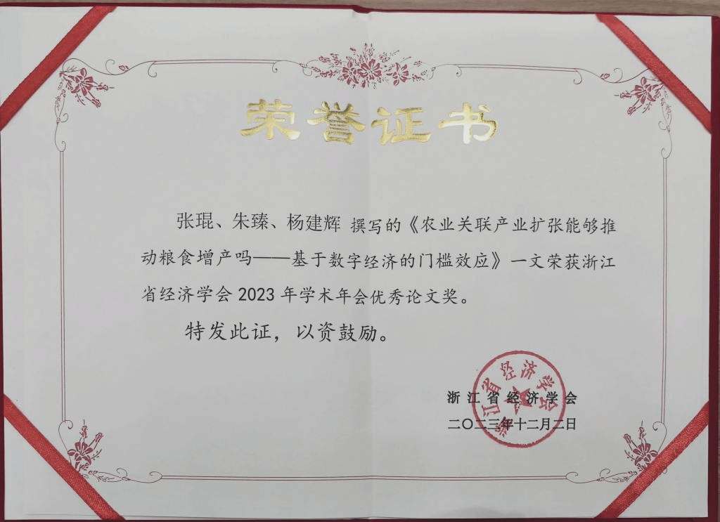 十大买球官网由顾光同教授带队,博士研究生朱书琦,硕士研究生金欣怡、姚玉秀和张琨分别就《数字金融如何赋能农村产业高质量发展:来自2011—2021年省域面板数据的实证》、《用能权交易制度是否提升全要素能源效率?——基于中国地级以上城市的考察》、《中国环境税改革对绿色全要素生产率的影响研究——基于“费”改“税”的实证考察》和《农业关联产业扩张能够推动粮食增产吗——基于数字经济的门槛效应》在平行论坛进行汇报。会议共评选出10篇优秀论文,由张琨、朱臻、杨建辉撰写的论文《农业关联产业扩张能够推动粮食增产吗——基于数字经济的门槛效应》获“优秀论文奖”。