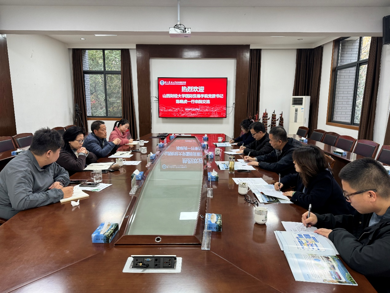 12月9日,山西财经大学国际贸易学院党委书记陈晓虎一行来院就党建与教学科研工作进行交流。交流会在西大楼208举行,活动由学院党委书记陈劲松主持。