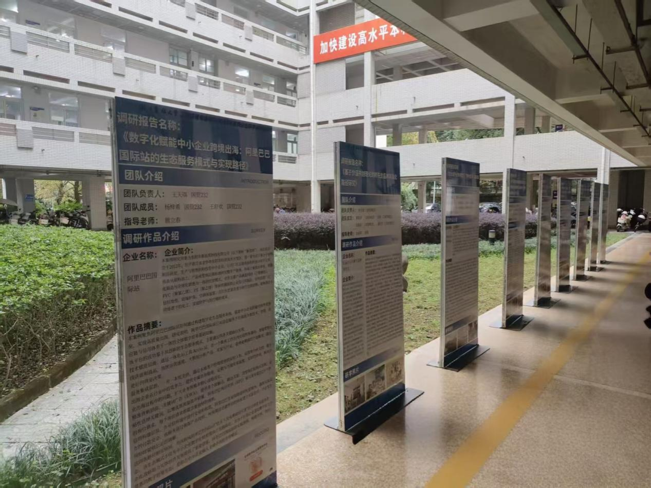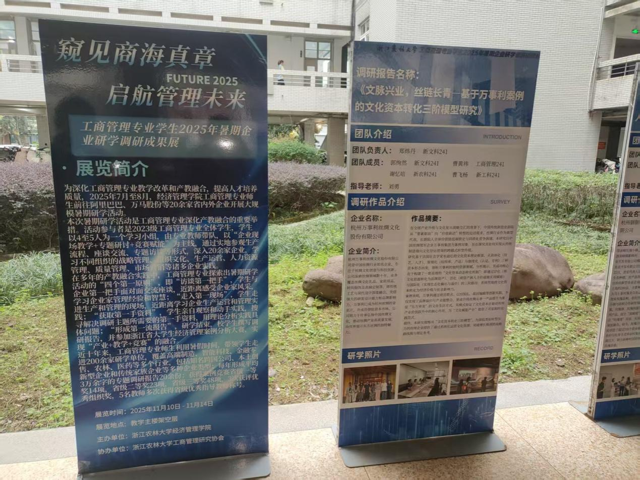近日,由十大买球官方网站买球赛十大平台主办、工商管理研究协会协办的“窥见商海真章·启航管理未来”暑期企业调研成果展在衣锦校区成功展出。本次展览集中展示了2023级工商管理专业学生在2025年暑期赴阿里巴巴、万马股份等20余家知名企业开展研学活动的调研成果,吸引了大量师生驻足参观。