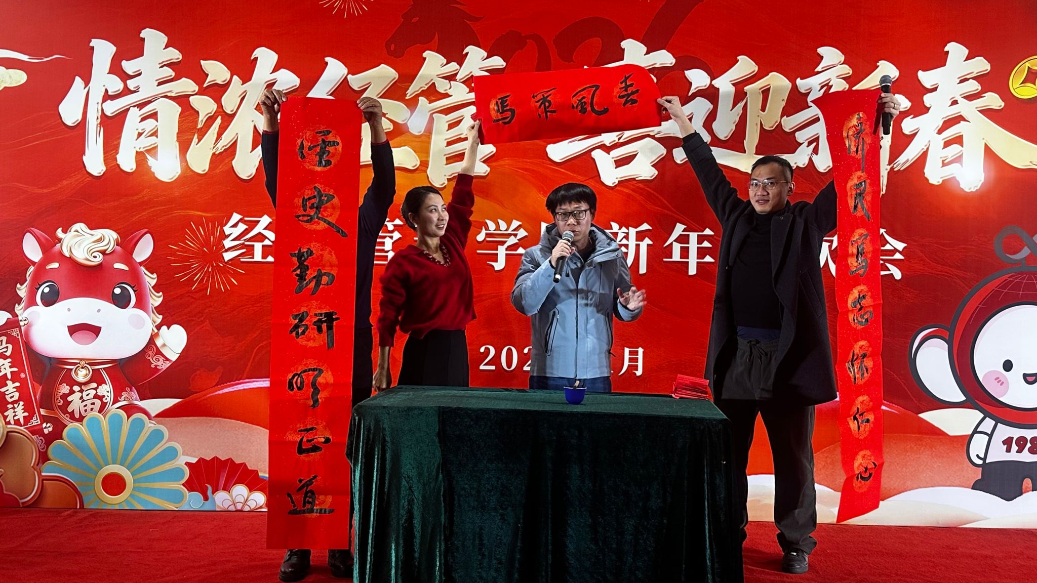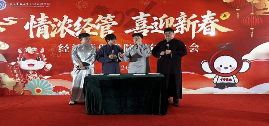 农经学科脱口秀、学生办相声、应经学科小品,则以幽默方式探讨科研态度与育人价值,引发阵阵共鸣;应经学科诗朗诵和书写春联,以美妙的诗句和遒劲的书法,为老师们送上春的祝福;企管学科魔术表演巧妙迭出,展现传统艺术的奇妙魅力;农经学科亲子合唱、管工与企管学科黄梅戏对唱,则以温馨歌声映照出学院教师和睦的家庭生活。