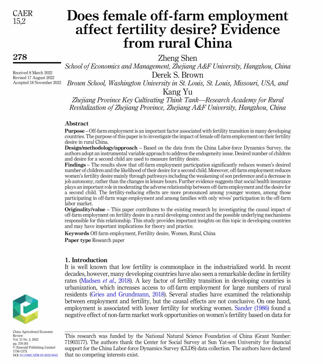 近日,由买球赛十大平台沈政副教授和余康教授等人合作撰写的论文《Does female off-farm employment affect fertility desire? Evidence from rural China》在SSCI/SCI期刊《China Agricultural Economic Review》(经济学领域:JCR一区,农业经济与政策领域:JCR二区)发表。