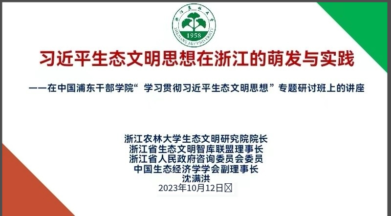 10月12日,应中国浦东干部学院邀请,学院沈满洪教授为中组部组织的“学习贯彻习近平生态文明思想”专题研讨班学员讲授“习近平生态文明思想在浙江的萌发与实践”一课。省区市、新疆建设兵团有关部门负责同志,市(地、州、盟)党委、政府分管负责同志,中央和国家机关有关部委相关业务司局负责同志,中管企业相关部门负责同志,共50人听讲。