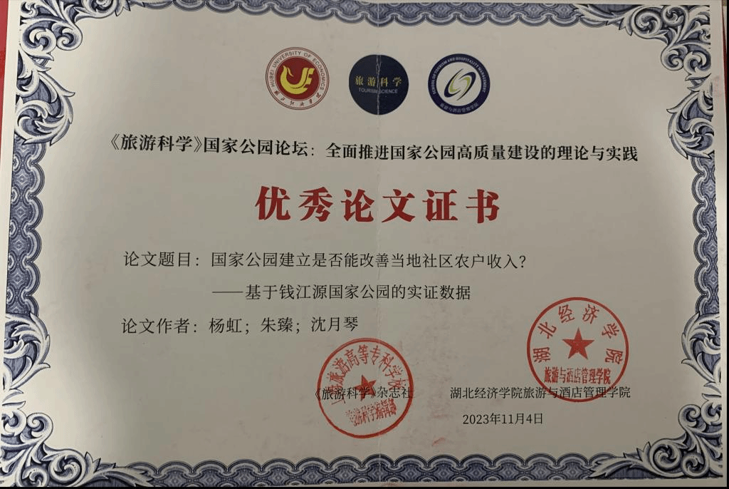 十大买球官网博士生杨虹、杨俊,硕士研究生王丹婷参加了本次会议,并分别做了题为《国家公园建立是否能改善当地社区农户收入——基于钱江源国家公园的实证数据》《“山水林田湖草沙”一体化下多部门协同生态治理对农户经济福利的影响》《政策支持、邻里效应与农户生态保护参与——基于钱江源国家公园的调查》的分会场报告。