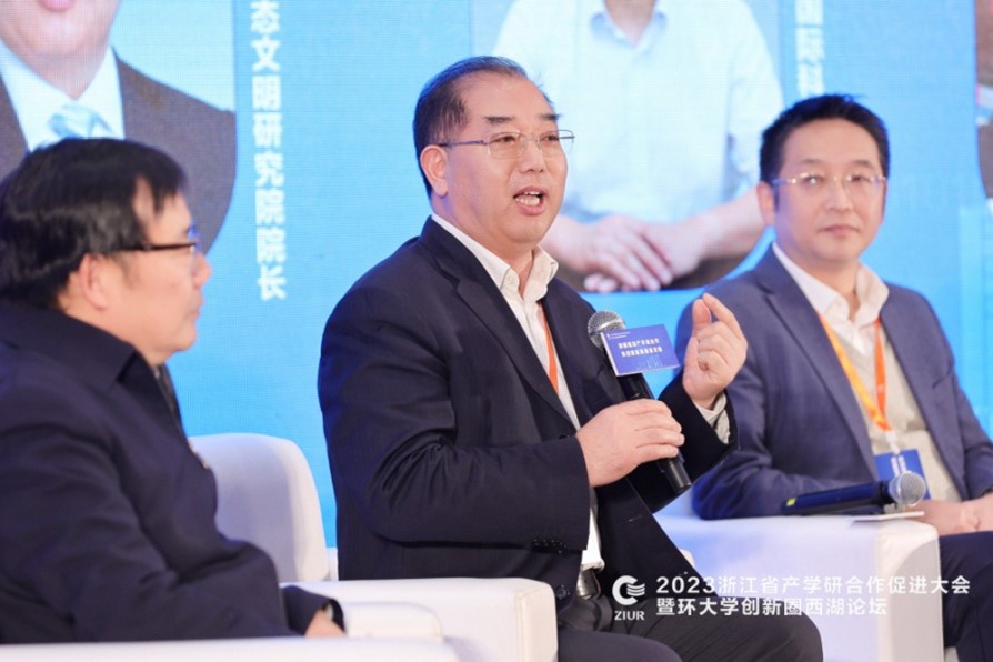 沈满洪教授在“共创共赢:环大学创新圈融合发展圆桌论坛”上发言。沈满洪教授通过案例证明了科学研究的供求对接的重要性,阐述了科学研究的战略导向、需求导向、问题导向等基本原则,并介绍了十大买球官方网站坚持把论文写在祖国的大地上、形成“一根科技竹、两颗富民果、三根小仙草”的生动实践。
