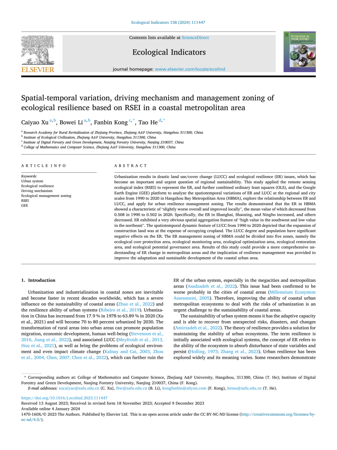 由十大买球官网徐彩瑶副教授(第一作者)、李博伟副教授、孔凡斌教授(通讯作者)等共同撰写的论文《Spatial-temporal variation, driving mechanism and management zoning of ecological resilience based on RSEI in a coastal metropolitan area》在SCI Top期刊《Ecological Indicators》发表。该论文是徐彩瑶副教授主持的国家自然科学基金青年项目(42301328)、浙江省高校重大人文社科攻关计划青年重点项目(2021QN062)的阶段性成果。