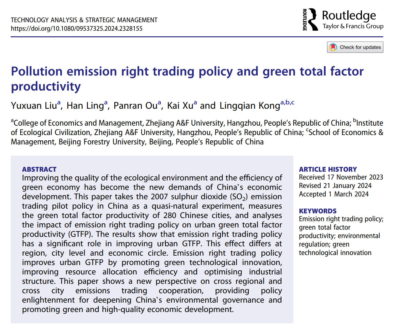 近日,由十大买球官方网站2020级国贸专业本科生刘雨璇、凌涵和欧盼苒共同撰写的学术论文《Pollution emission right trading policy and green total factor productivity》在《Technology Analysis & Strategic Management》上发表,该期刊为SSCI收录期刊、ABS2星,论文通讯作者为国贸系孔令乾老师。该论文是孔令乾老师指导的浙江省大学生科技创新活动计划(新苗人才计划)“排污权交易机制对企业绿色全要素生产率的影响机理与对策研究”的阶段性成果,同时也是沈满洪教授主持的教育部哲学社会科学研究重大专项项目“习近平生态文明思想在中国大地的生动实践研究”和国家社科基金教育学一般项目“中国式现代化背景下大学生生态文明教育研究”的阶段性成果。此外,国贸系蒋琴儿教授、钱志权教授、熊立春副教授、刘琼博士以及管工学科徐凯博士亦参与指导并提供修改建议。