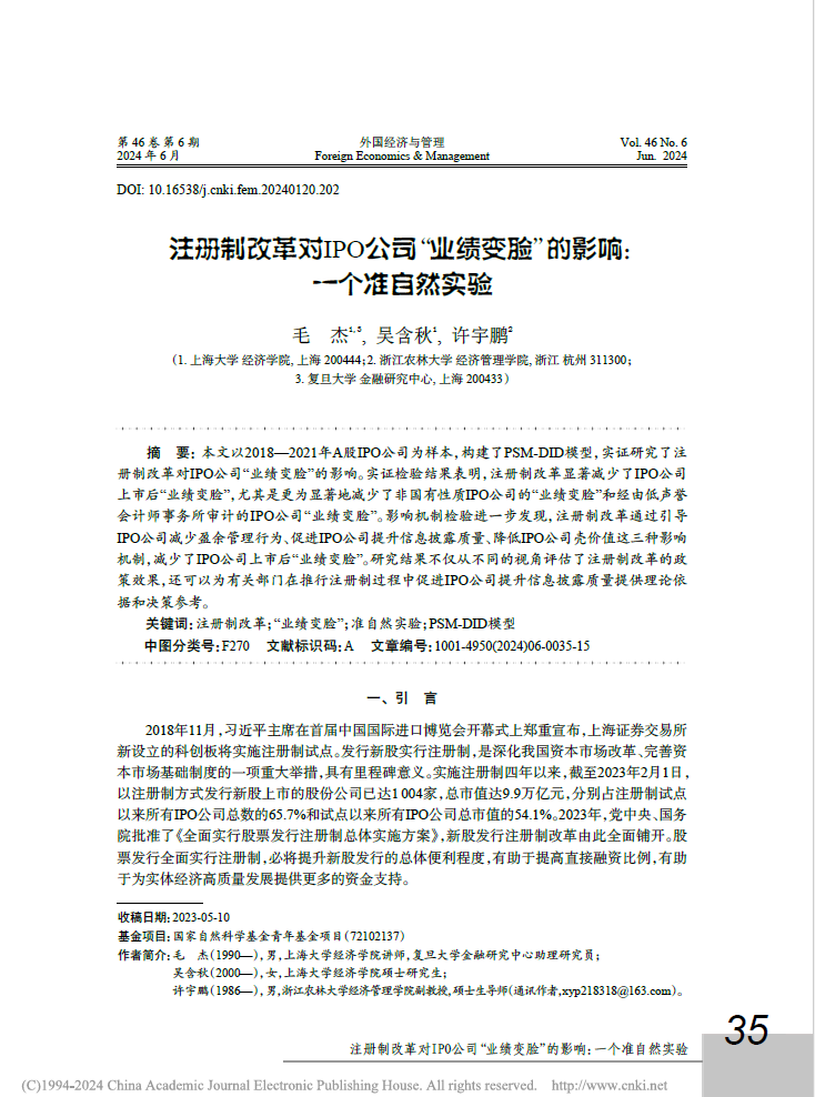 由十大买球官网许宇鹏副教授作为通讯作者合作撰写的论文《注册制改革对IPO公司“业绩变脸”的影响:一个准自然实验》在《外国经济与管理》(学校A类期刊、CSSCI、FMS管理科学高质量期刊)2024年第6期上发表。该论文是许宇鹏副教授主持承担的国家自然科学青年基金项目的阶段性研究成果。
