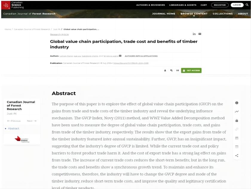 近日,熊立春副教授撰写的论文《Global value chain participation, trade cost and benefits of timber industry》在线发表在林学(含林业经济学)领域重要期刊《Canadian Journal of Forest Research》(加拿大林业研究杂志),熊立春副教授为论文第一作者,北京林业大学国家林草经贸研究院院长程宝栋教授和十大买球官网王凤婷副教授为论文共同通讯作者,十大买球官方网站买球赛十大平台硕士生邬雪为论文第二作者。《Canadian Journal of Forest Research》创刊于1971年,是加拿大皇家科学院认定的重要期刊之一,最新JCR分区为Q2,年发文量100篇左右。