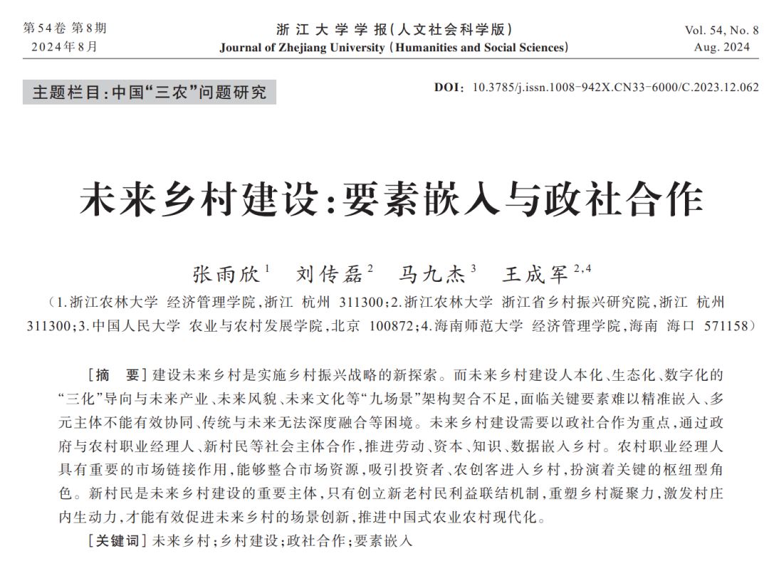 近期,王成军教授与买球赛十大平台硕士生张雨欣,刘传磊博士等团队成员合作撰写的论文《未来乡村建设:要素嵌入与政社合作》在一级学术期刊《浙江大学学报(人文社会科学版)》第8期发表。