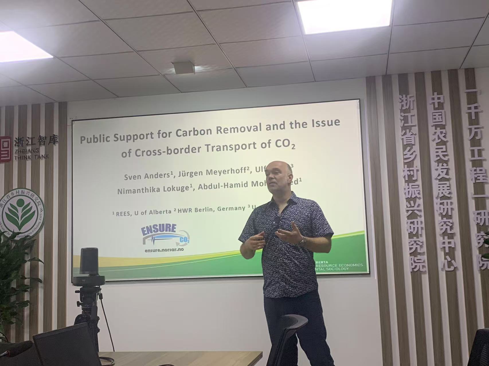 Sven Anders教授主要分享了团队的最新研究成果。主要结合实验经济学研究方法,通过比较欧盟和加拿大的实践案例,深入分析了碳捕捉和储存技术在降低碳排放中的公众认知与偏好。