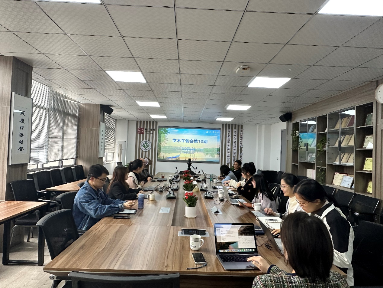 学术午餐会过程中,朱哲毅副教授对参会老师表示欢迎。杨兴杰博士基于农业绿色发展要求、国家倡导种养结合的生态循环农业以及稻虾共作模式大力推广等背景,发现稻虾共作模式对农户技术获取、经营管理和市场对接等要求更高,农户实际获取到的技术与稻虾共作模式所需技术之间存在差距。而数字技术具有多途径、低成本和高效率的特性,基于此提出数字技术使用是否会促进农户稻虾共作模式选择,若促进能否通过社会化服务来实现。参会老师就分享内容进行了热烈讨论,促进了后续研究的新发展。