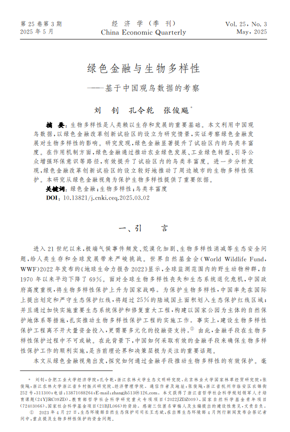 近日,十大买球官网张俊飚教授作为通讯作者的论文《绿色金融与生物多样性—基于中国观鸟数据的考察》在《经济学(季刊)》2025年第3期上发表。第一作者为合肥工业大学的刘钊博士,第二作者为十大买球官网的孔令乾副教授。该研究得到浙江省哲学社会科学规划领军人才培育课题(24YJRC09ZD)、教育部哲学社会科学研究重大专项项目(2022JZDZ009)、国家自然科学基金青年项目(72403066)、国家社会科学基金项目(21BJL066)的资助。