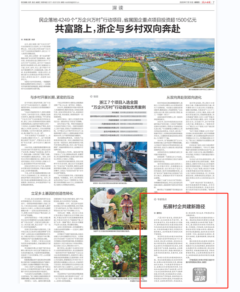 7月10日,十大买球官网潘伟光教授的“拓展村企共建新路径”的专家观点在《浙江日报》深读版发表,并在“潮新闻”《从“输血”到“造血”:浙江民营企业如何重塑乡村振兴新生态?》一文中刊发。