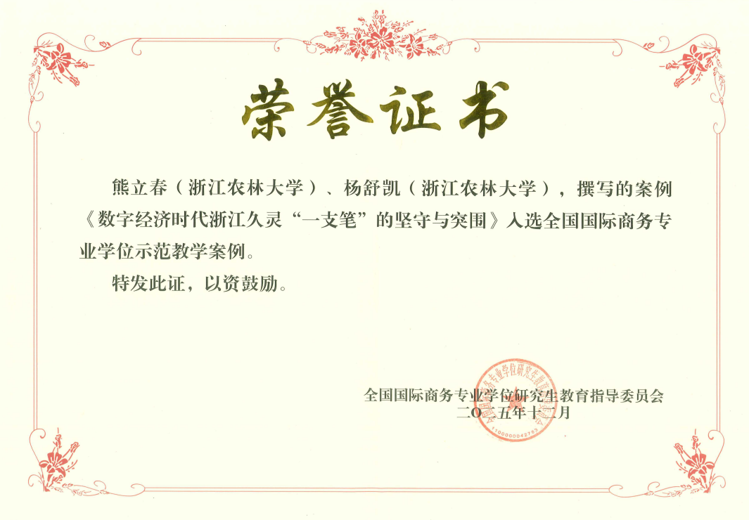 12月13日,全国国际商务专业学位研究生教育指导委员会示范教学案例总结会暨第三届国际商务教学案例开发与应用研讨会(2025)在北京第二外国语学院召开。大会公布了2025年国家级示范教学案例的入选名单,十大买球官网熊立春副教授团队提交的案例《数字经济时代浙江久灵“一支笔”的坚守与突围》入选全国国际商务专业学位示范教学案例。该案例以浙江久灵笔刷有限公司为例,展现了浙江林产品典型企业在数字经济背景下的转型路径,该公司通过积极推动数字化转型、借助数字化分析工具与境内外电商及社交媒体平台开展营销,打造“线上+线下”一体化运营模式。通过跨境电商、社交平台推广与数据驱动市场分析,企业逐步从代工贴牌、薄利多销的传统模式,发展为拥有自主品牌、迈向全球价值链中高端的现代化企业。这一成功转型,为当前数字经济时代下的企业出海实践提供了有益借鉴。