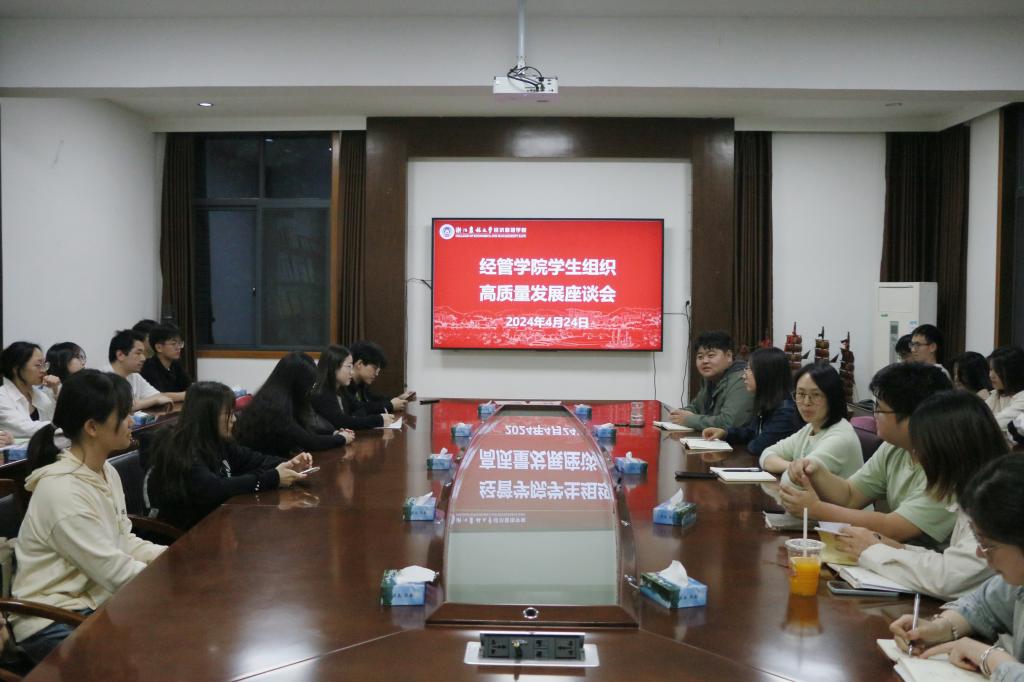 4月24日晚,十大买球官方网站成功举办学生组织高质量发展座谈会。学院学生工作负责人胡云云主持会议,与院团委书记钟程凯、学生会秘书长蔡广越、辅导员及各部门负责人、优秀工作者共同探讨学生组织的挑战和未来发展。