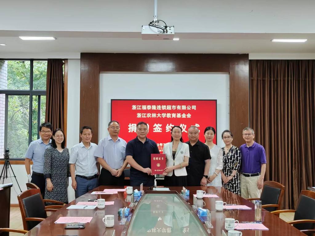 7月20日上午,买球赛十大平台与浙江福泰隆连锁超市有限公司战略合作暨捐赠签约仪式在衣锦校区西大楼208会议室举行。浙江福泰隆连锁超市有限公司总经理何美庆、副总经理周跃进、行政总监唐俊、财务总监吴敏、校友办主任、校教育基金会秘书长哀建国、买球赛十大平台院长吴伟光、党委副书记胡云云、教授张群祥以及学生代表参加了本次签约仪式,十大买球官方网站副校长胡祖吉出席,仪式由党委书记陈劲松主持。